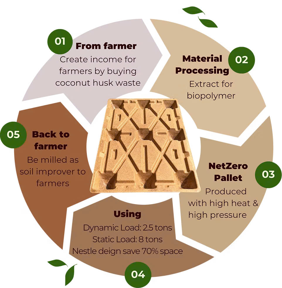 Environmentally friendly export pallets made without wood, compliant with ISPM15, and produced from waste coconut husks.